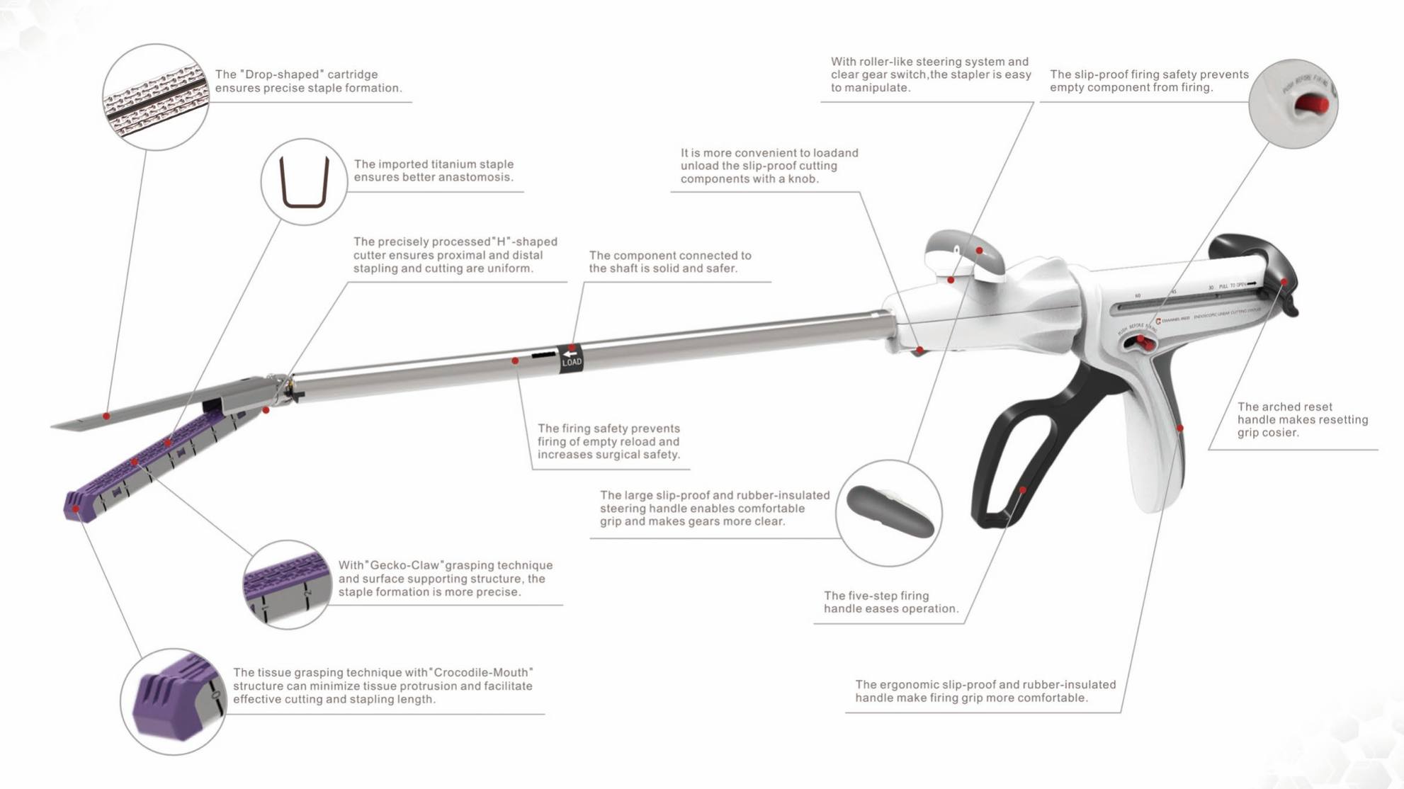 Indicated for resection, transection and anastomosis of lung and bronchial tissues, stomach and intestine in open or endoscopic surgery