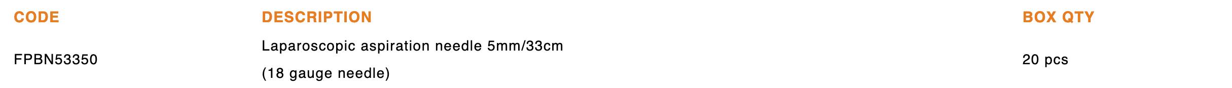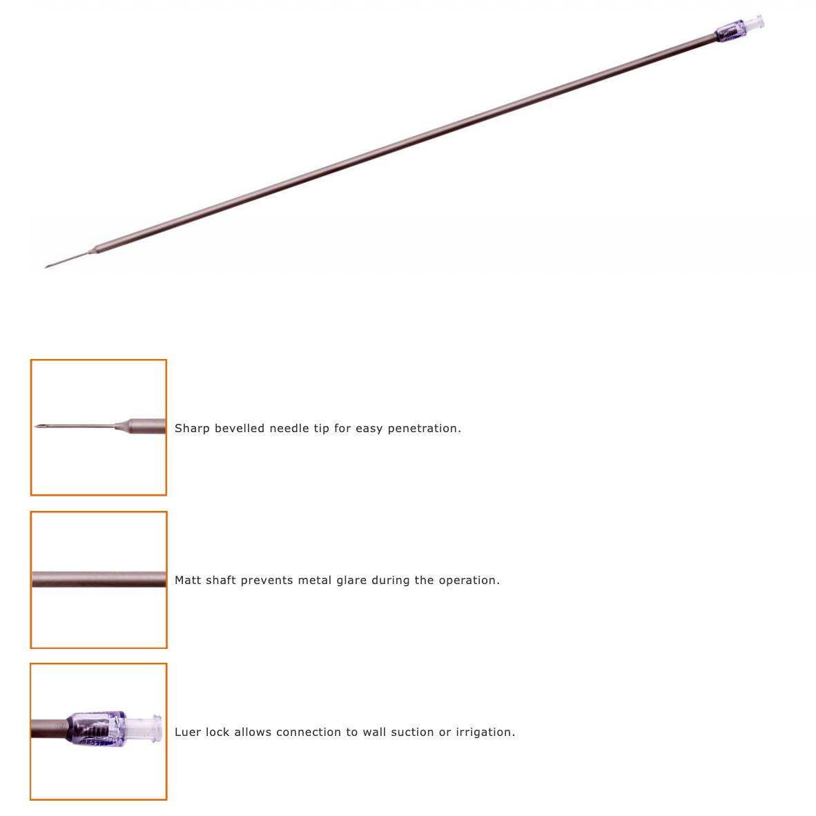 The Unimax Laparoscopic Aspiration needle is used in laparoscopic procedures for injection or aspiration of fluids to/from organs or cysts.